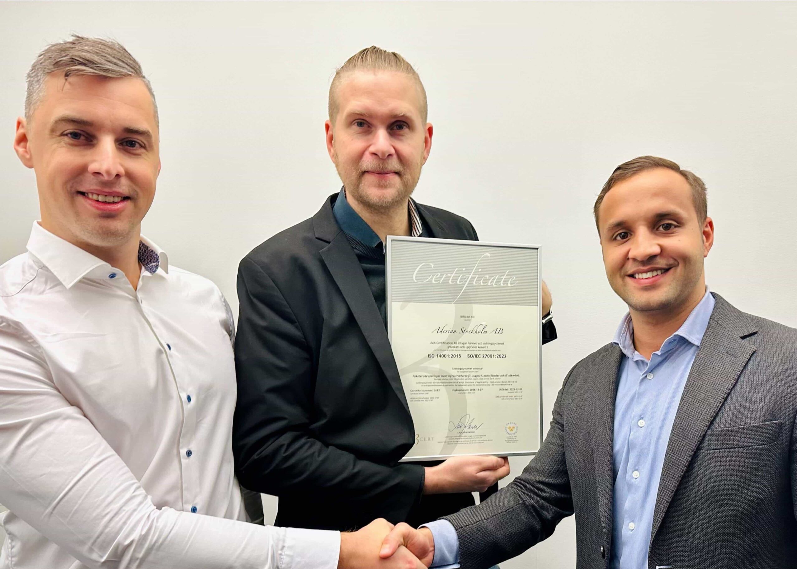 Aderian Stockholm has been certified according to the international standard for information security ISO27001:2022 and environmental management 14001:2015. As the latest version of ISO/IEC 27001:2022 is relatively new, Aderian will be one of the first companies in Sweden to achieve certification. Today, a certificate handover took place where audit manager Fredrik Larsson from A3CERT handed over the certificate at Aderian’s office in Stockholm.